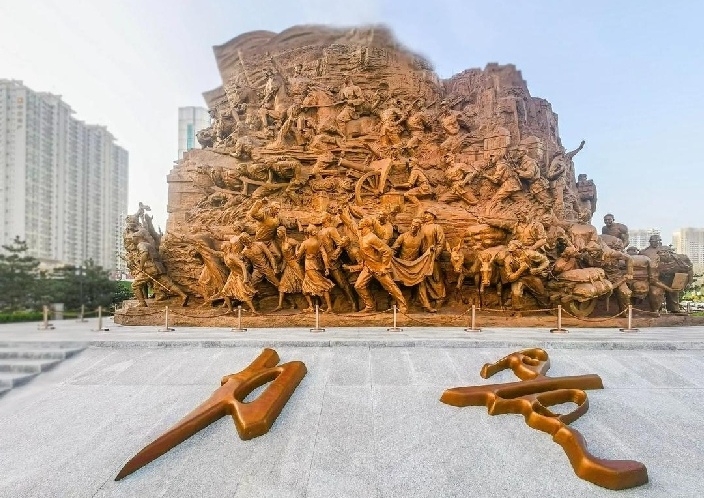 这座雕塑位于太原五一广场,以磅礴的气势展现了山西革命老区在抗日战争时期万众一心、共赴国难的英勇精神。雕塑中的人物聚集在蒸汽机车头周围,每一个都栩栩如生,目光坚定,透露出战胜敌人的勇气与决心。
