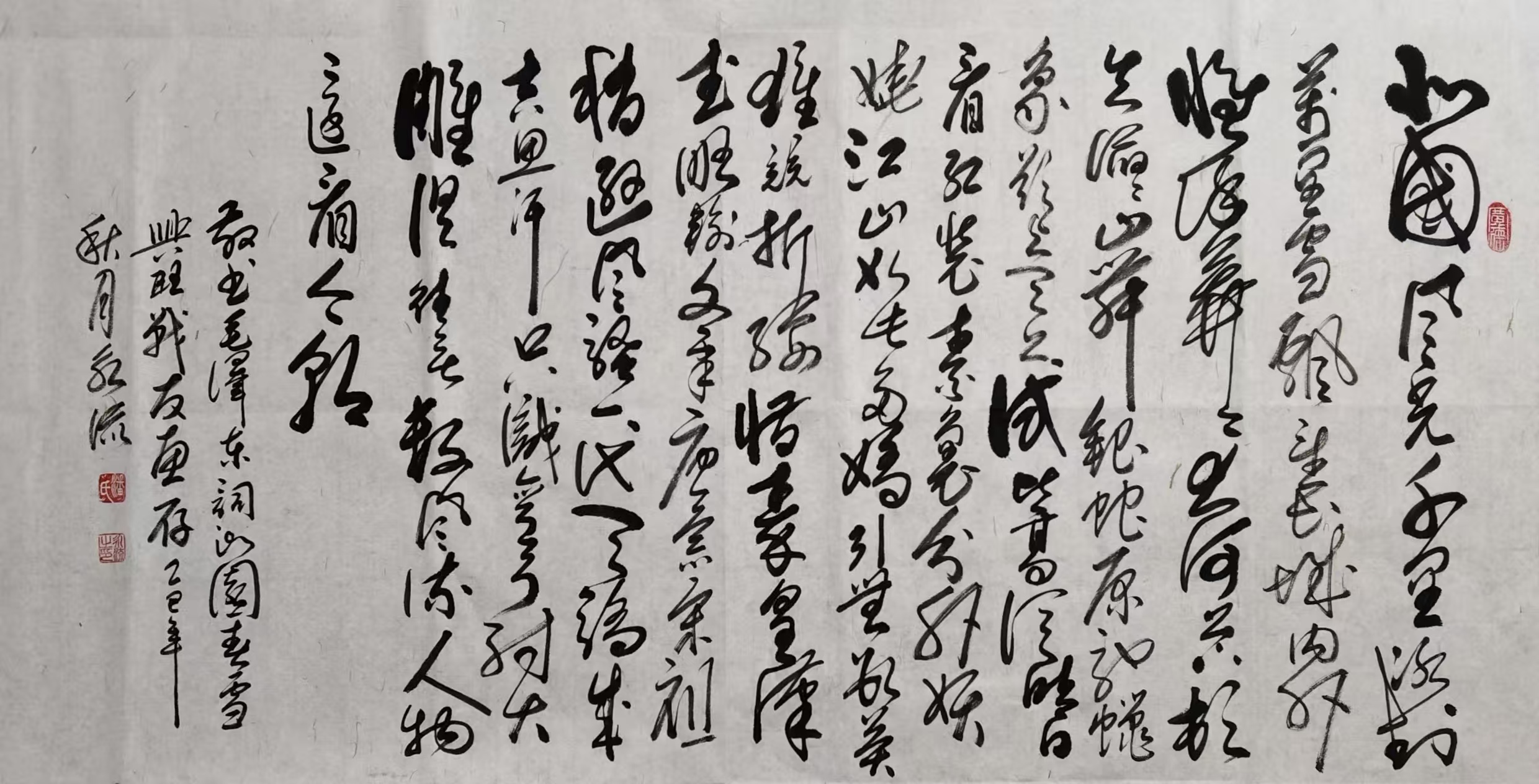 北国风光,千里冰封,万里雪飘。望长城内外,惟余莽莽;大河上下,顿失滔滔。山舞银蛇,原驰蜡象,欲与天公试比高。须晴日,看红装素裹,分外妖娆。江山如此多娇,引无数英雄竞折腰。惜秦皇汉武,略输文采;唐宗宋祖,稍逊风骚。一代天骄,成吉思汗,只识弯弓射大雕。俱往矣,数风流人物,还看今朝。