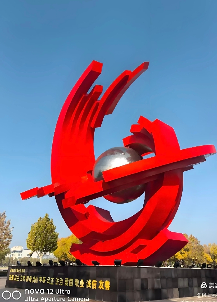 该雕塑位于黄河公园主轴线上,高22米,底座高1.7米,采用红色的不锈钢材质,以抽象的螺旋上升结构,表现出了极具成长性的张力和势不可挡的升力。雕塑的多线条融合象征着黄河与渤海的融汇、新区与东营市的融汇。