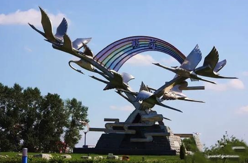 《鹤翔高鸣》雕塑于2009年6月27日建成,成为鹤岗市的地标性景观。