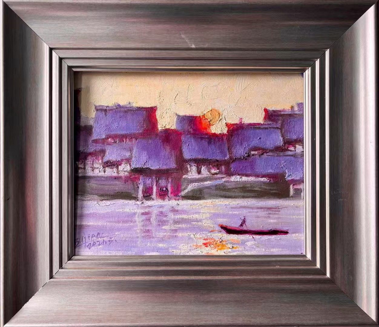 府河小调—油画。20cmx25cm。布面画板。那时候的府河是有光的——画家步健题记。 那时候的河