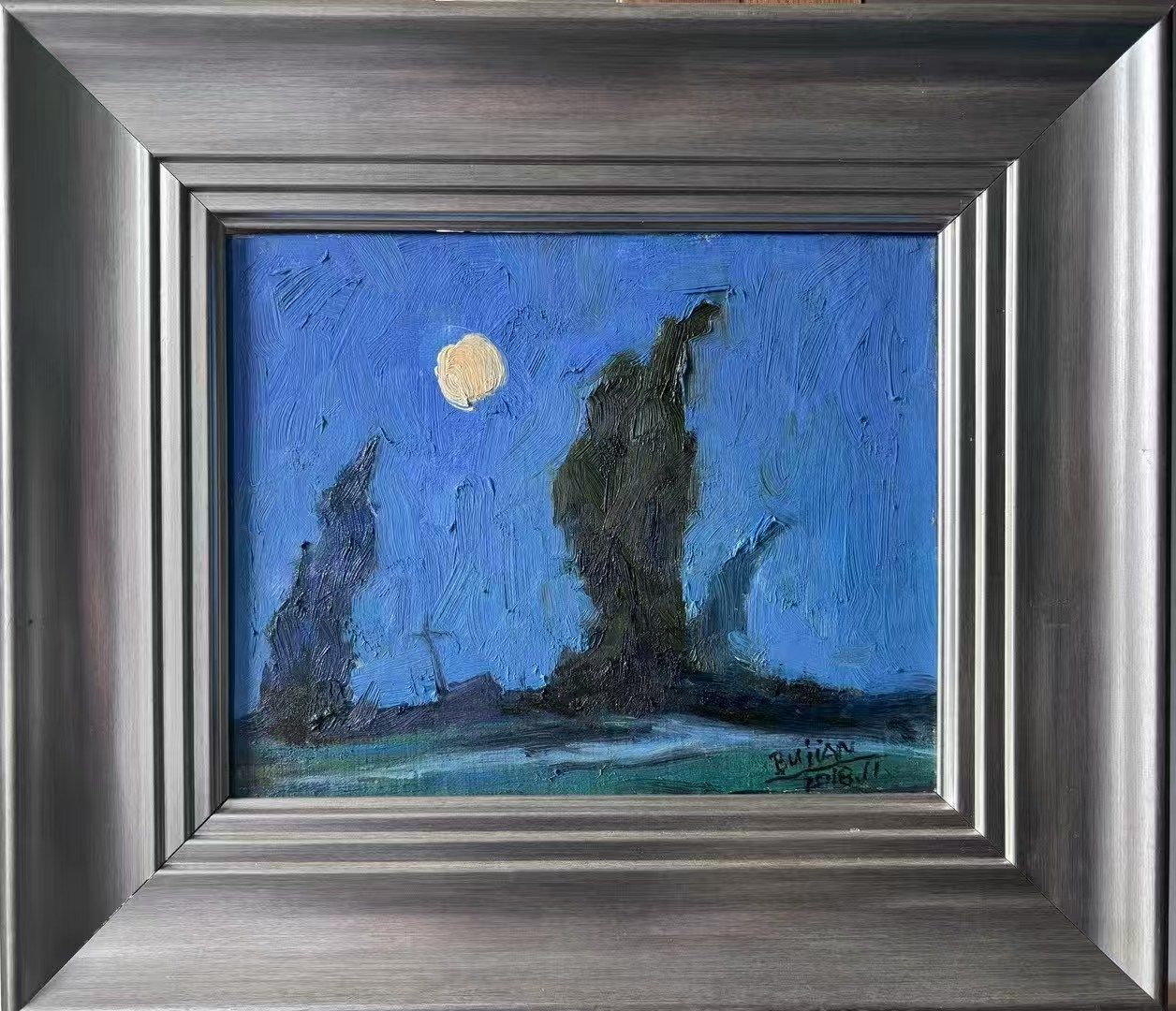 亮初升—油画。20cmx25cm。布面。那是月圆时候的梦境——画家步健题记。