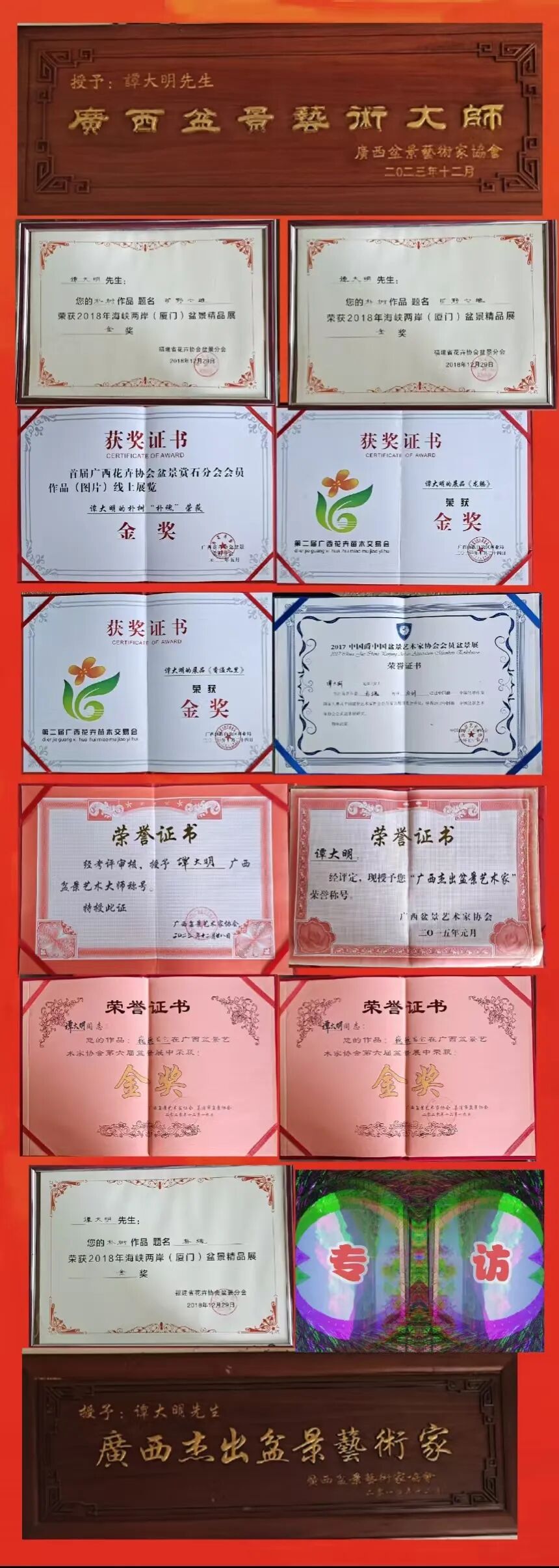 除了《把酒欢歌》,谭大明的盆景作品在全国、广西区以及地(市)、县级的盆景展上屡获佳绩。先后获得金、银、铜奖127个,其中全国金奖5个、银奖16个、铜奖15个;广西区一等奖1个、金奖9个丶银奖13个、铜奖18个;地(市)、县级特等奖1个、金奖10个、银奖16个丶铜奖23个。这些荣誉的背后,是谭大明无数个日夜的辛勤付出,是他对盆景艺术执着追求的最好见证。鉴于他在盆景技艺水平的突出成绩和影响力及推广传播能力,经盆景专家考核评审,先后于2014年评为“广西盆景艺术家,2023年评为广西盆景艺术大师”称号。