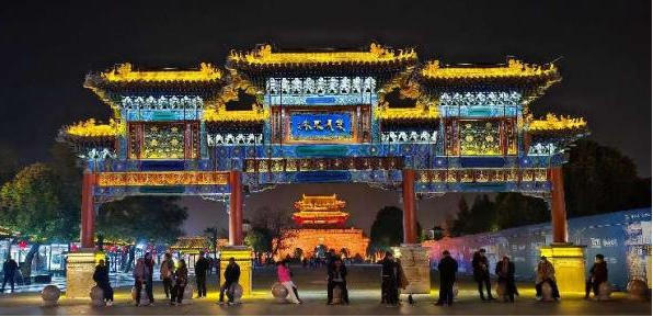 古城的山门牌楼很壮观 城门楼子一改白天的土灰,光彩照人