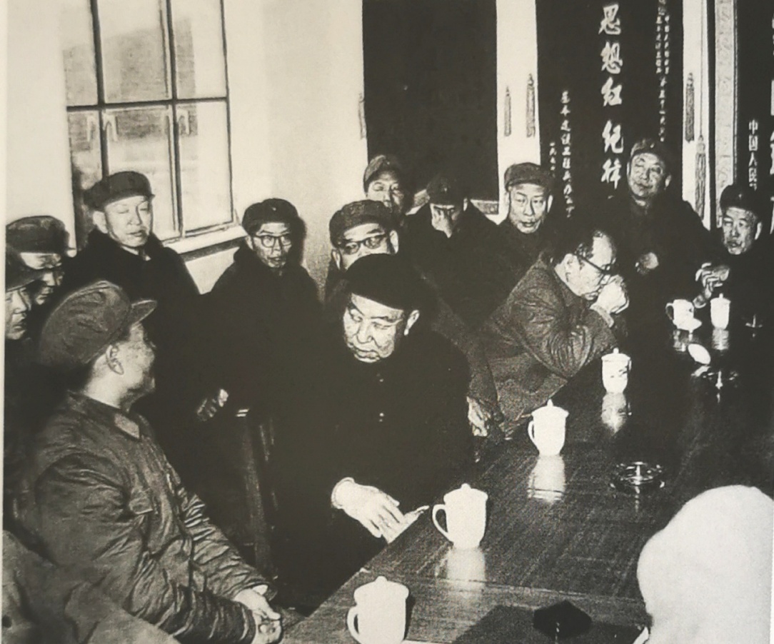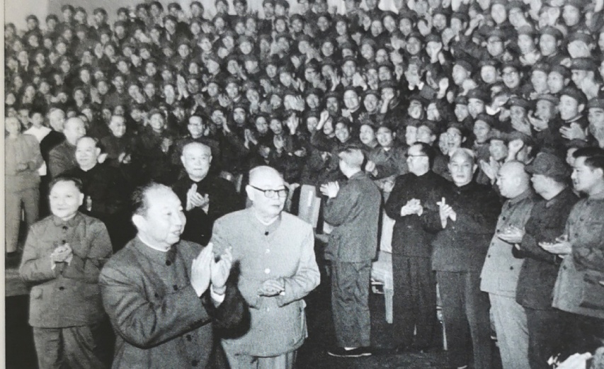 1980年元旦的下午,时任中共中央主席的华国锋同志,在中共中央政治局委员、总政治部主任韦国清、国务院副总理谷牧和北京市市长林乎加,基建工程兵党委书记、主任李人林等同志陪同下,一同乘大轿车来到曾被铁道兵命名为"雪山铁九连"的基建工程兵51团9连承建的北京汽车修造六厂工地,和干部、战士、职工、家属一起欢庆元旦。(见下图)