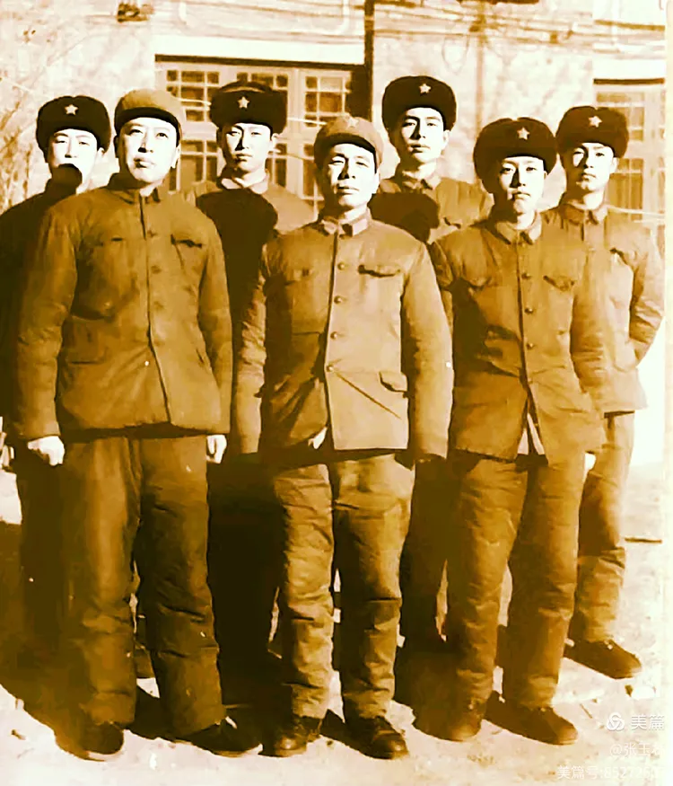 师政治部宣传科长谭国兴、干事金长里和师报道组人员合影: